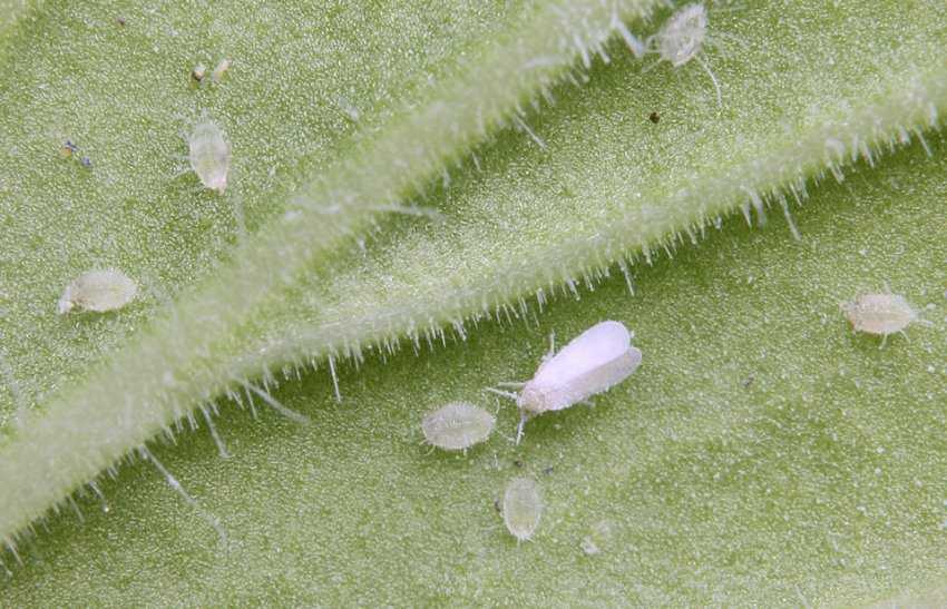 - Белокрылка — о наличии говорит блестящая падь на растении. Действенной будет обработка листьев раствором кондифорома (0,1 мл на 1000 мл воды).