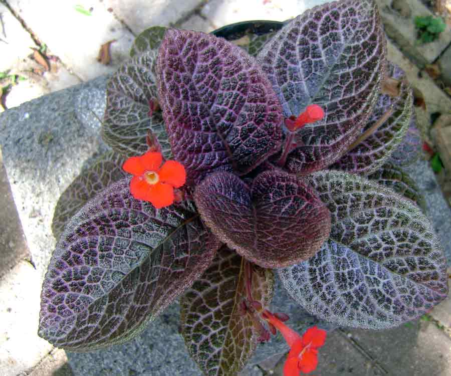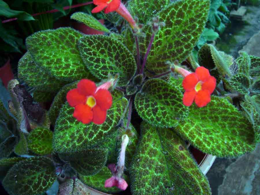 - Эписция ползучая – травянистое многолетнее растение с длинными свисающими побегами. Сердцевидные у основания листья длиной 8 см и шириной до 5 см сверху оливково-зеленые, снизу коричнево-красные. Венчик внутри розовый и красный снаружи. Цветение вида начинается в середине лета и заканчивается ранней весной.