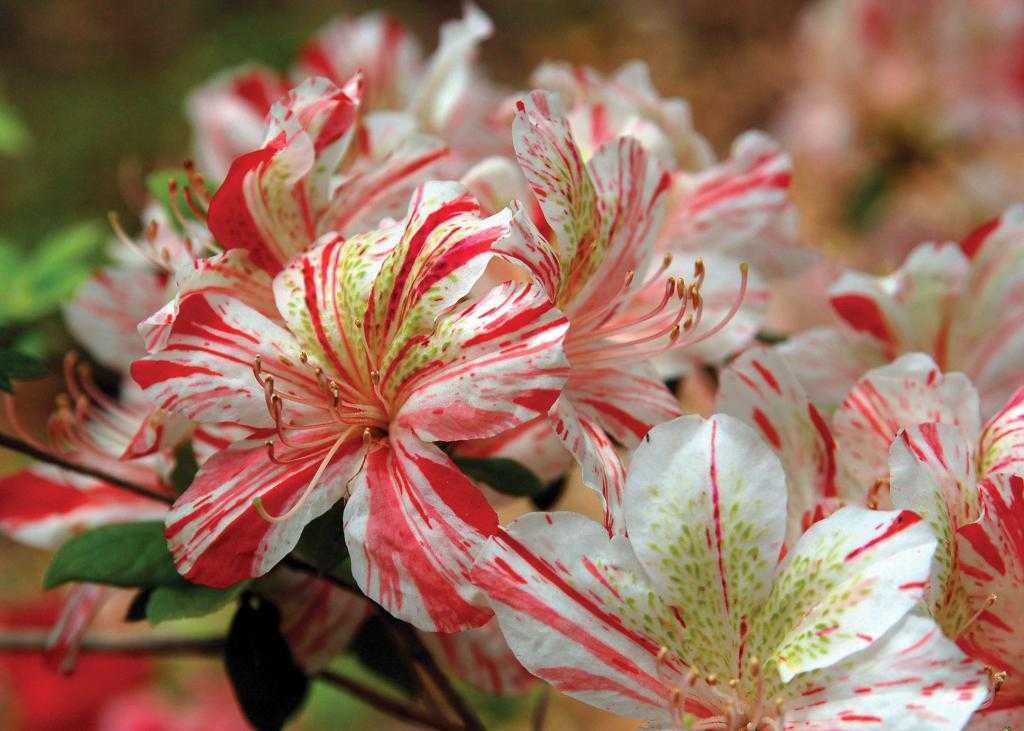 Azalea – это имя гордо носят некоторые виды, включённые в род рододендрон. Хотя раньше они и были выделены в отдельный род, из-за генетического сходства их объединили в один род – Rhododendron. Различие между ними лишь в количестве тычинок, которых у азалий 5, а у рододендронов более десятка.