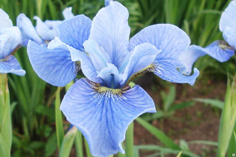 - Ирис сибирский. Высота довольно выносливого цветка составляет примерно 1 метр. Узколинейные светло–зеленые листья, отсутствие бородки на наружных долях околоцветника – основные признаки данного вида.