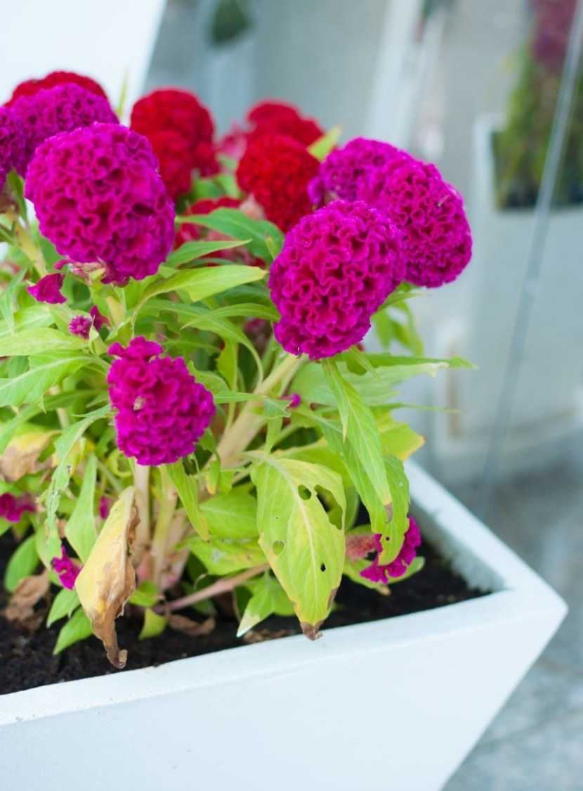 В декоративном уличном вазоне из бетона или природного камня лучше рассаживать целозии с яркими соцветиями, а в вазоне белого цвета гармонично будет выглядеть монохромная посадка растения с цветками одного, но очень яркого оттенка. Это всегда выглядит оригинально и впечатляюще.