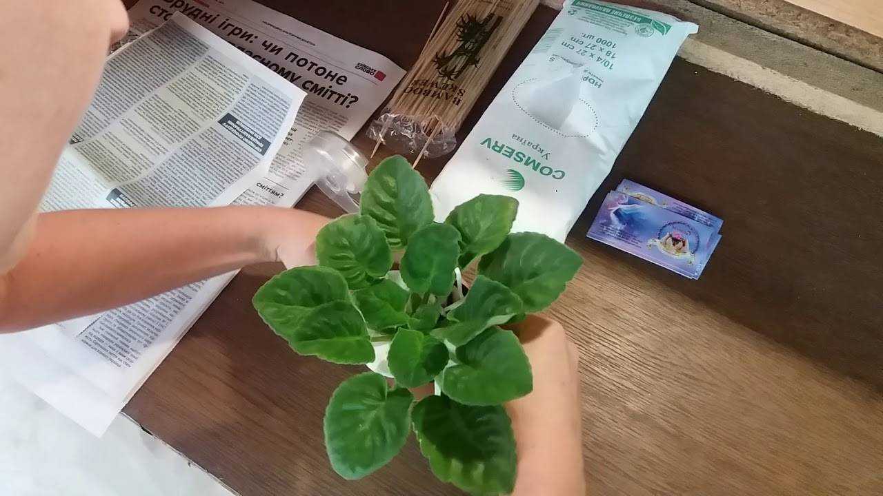 Предварительно защитите землю в горшке, поставив его в пакет и завязав так, чтобы вода не попадала на почву. Листочки моют по отдельности, под тонкой струёй теплой воды