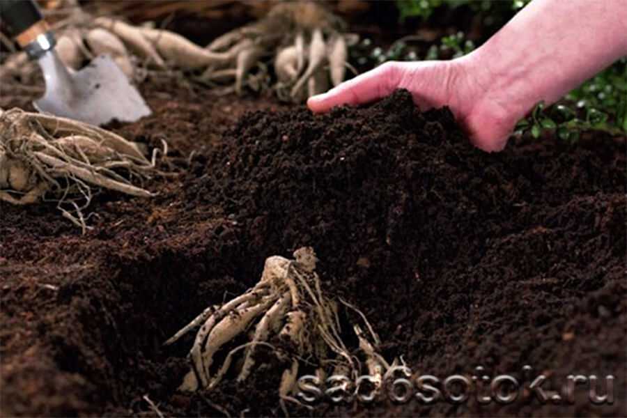 Грунтовые воды не должны близко залегать и подниматься выше 60–70 см к поверхности почвы. Клубни и корни при малейшем застое воды начинают загнивать. Избежать этого можно, устроив на дне ямы дренаж из битого красного кирпича, щебня или мелкого камня.
