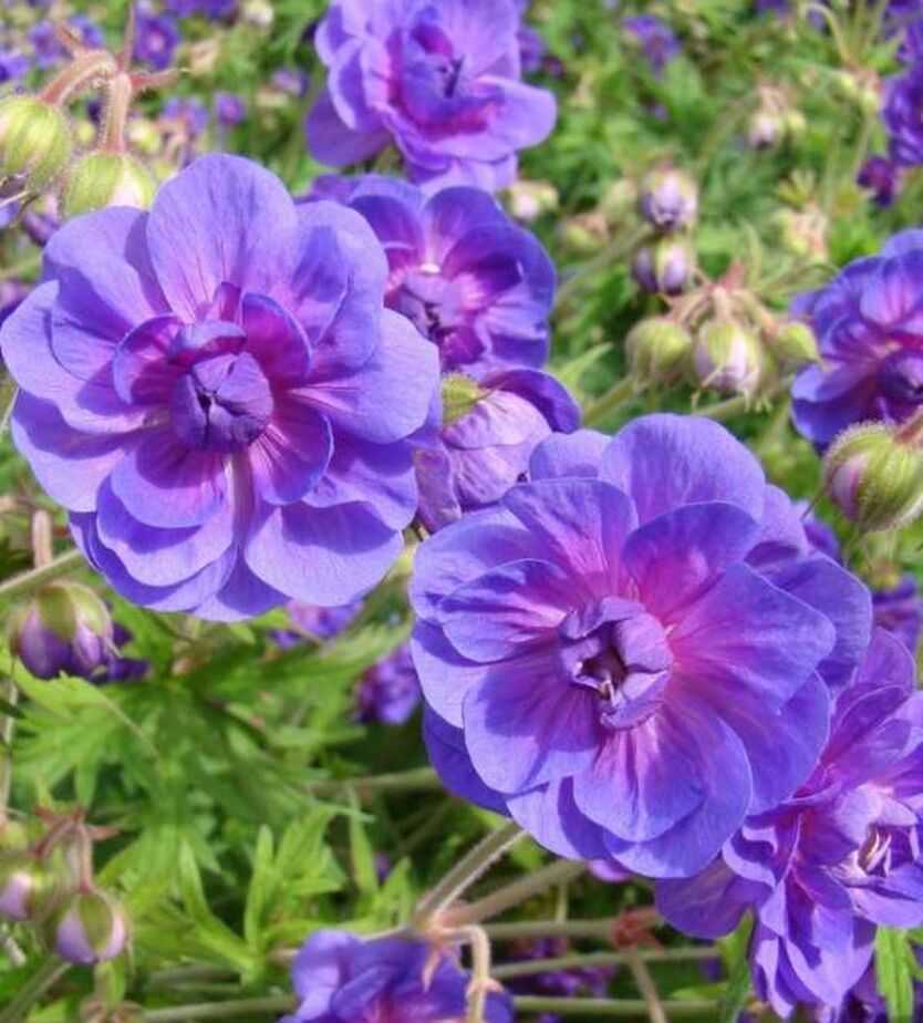 Герань гималайская Пленум относится к семейству Герань, но тоже является махровым цветком. Её пышные фиолетовые лепестки образуют крупные соцветия на высоком кусте. Это растение можно выращивать в саду или на клумбе.