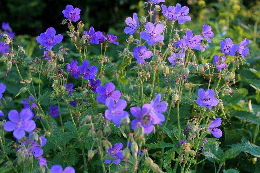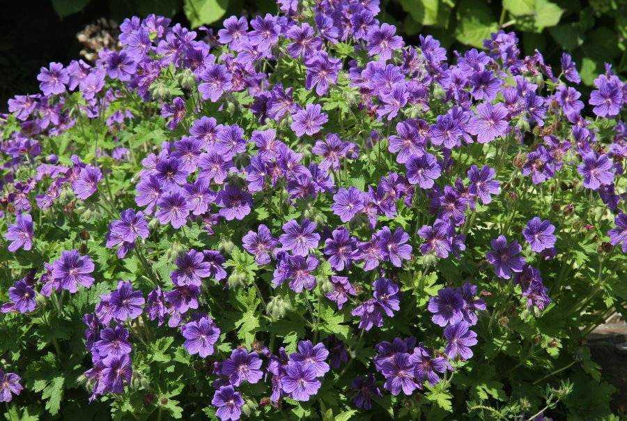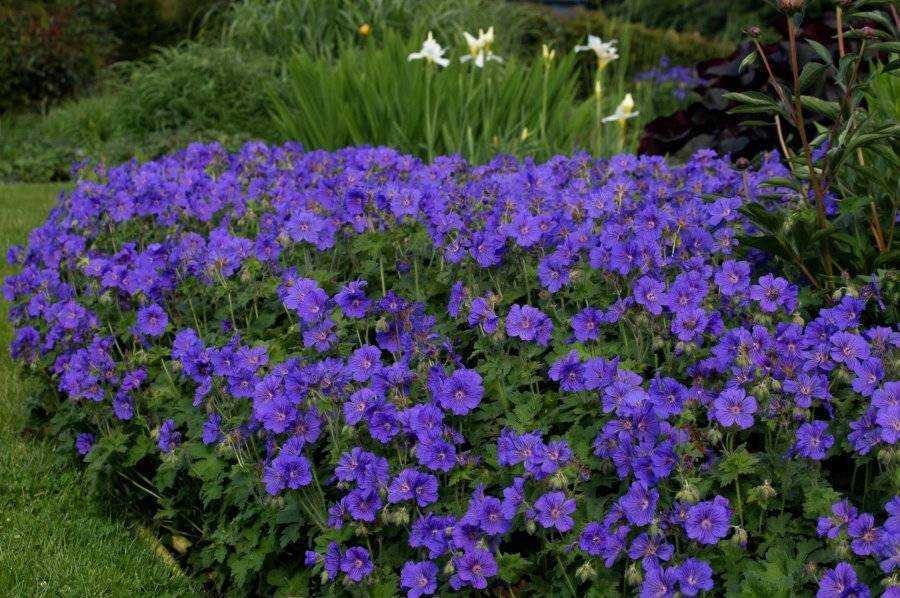 Зацветает растение в июне. Лесная герань в саду фото оформление участка, использование для групповой посадки.