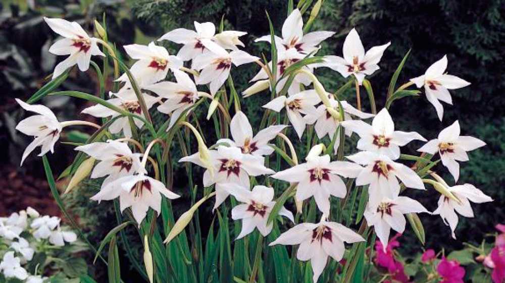 Шпажник идеально дополняется хостами – декоративным многолетники растениями с привлекательными соцветиями, зрительно оттеняющими гладиолусы и прикрывающими их оголенные нижние части стеблей.