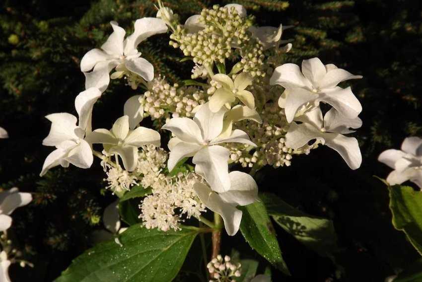 Помимо многоцветковых сортов с большими сферическими соцветиями, состоящими только из плодных цветов, интересны гортензии с бесплодными цветами, окруженными плодными, например: