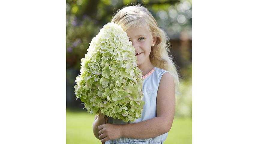 Куст гортензии метельчатой высотой до 2 м с очень крупными (до 40 см) плотными соцветиями, вначале цветения зеленоватыми, после белыми. Сорт отличается пышным и продолжительным цветением.