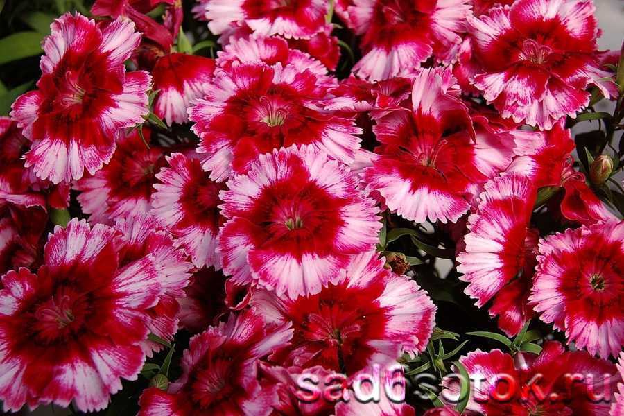Замечательная вариация гвоздики Геддевига с густоветвистыми стеблями светло-зеленого цвета, образующими небольшие кусты высотой около 35 см. Растения сплошь покрыты махровыми цветками диаметром 4–5 см. Лепестки атласные, малиново-черные с зубчатым краем и яркой белой каймой.