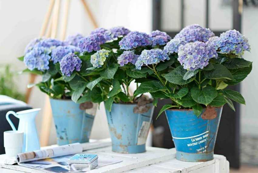 Синяя садовая гортензия крупнолистная выращенная в контейнерной культуре.