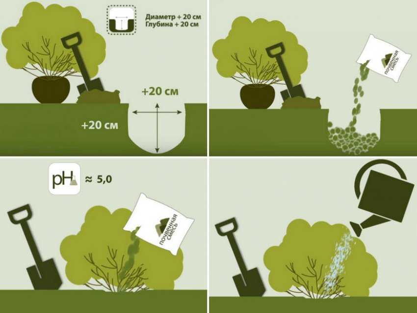 Заниматься пересадкой нужно только в пасмурную погоду. В яму укладывают удобрение, погружают в неё куст, засыпают пустоты землёй, после чего проводят полив, мульчирование торфом. Если погода резко меняется на солнечную и жаркую, потребуется организовать затенение. Без дождей полив выполняют утром, до 10 часов, или в вечернее время — путём опрыскивания кроны.