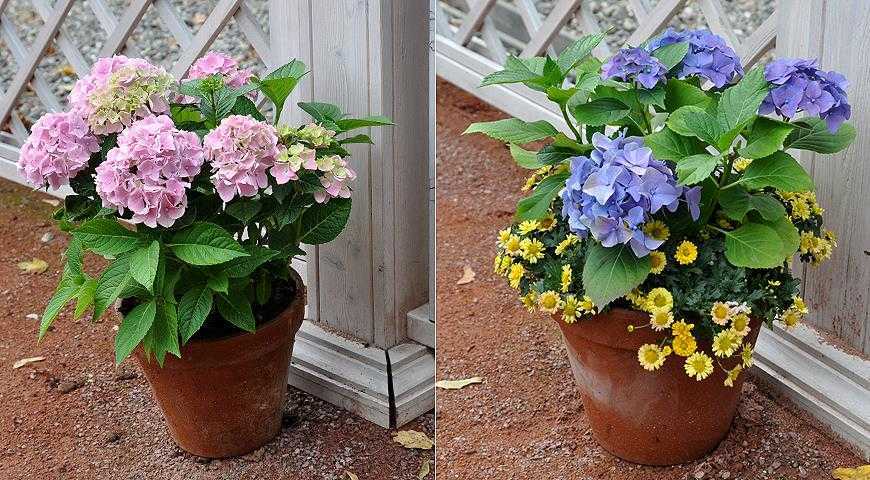 Гортензии высаживают в горшки подходящего объема в смесь, составленную из равных частей садовой земли, полуперепревшего хвойного опада и торфа (важно, чтобы она была рыхлой и имела кислую реакцию). Готовые смеси для гортензий можно приобрести в специализированных магазинах и садовых центрах