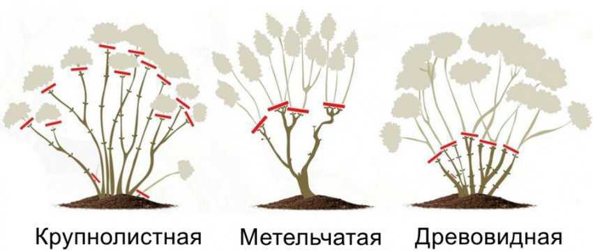 Обрезка. Санитарная обработка проводится в том числе и осенью. Нужно обрезать все сухие соцветия. Поскольку в противном случае весь куст сломается под тяжестью выпавшего снега. Стандартная обрезка проводится для прореживания и подготовки большей части сортов. Крупнолистный вид требует другого подхода. Обрезают только двухлетние побеги.