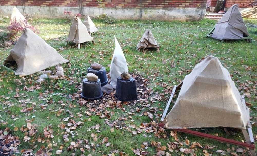 Если кусты посажены группой, можно сделать для них общее укрытие. При таком виде укрытий каждый куст мульчируется. Затем вокруг группы по кругу устанавливаются железные или деревянные колья. Конструкцию обматывают мешковиной или укрывным материалом. Сверху всё накрывают слоем пленки или рубероида.