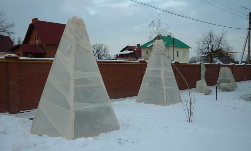 Высокие старые кусты имеют плохо гнущиеся побеги, поэтому описанные способы для них не подходят. Их связывают и укутывают укрывным материалом. Над кустом крестообразно устанавливают проволоку или п-образную арматуру. В результате получается своеобразный навес, который накрывают плёнкой.
