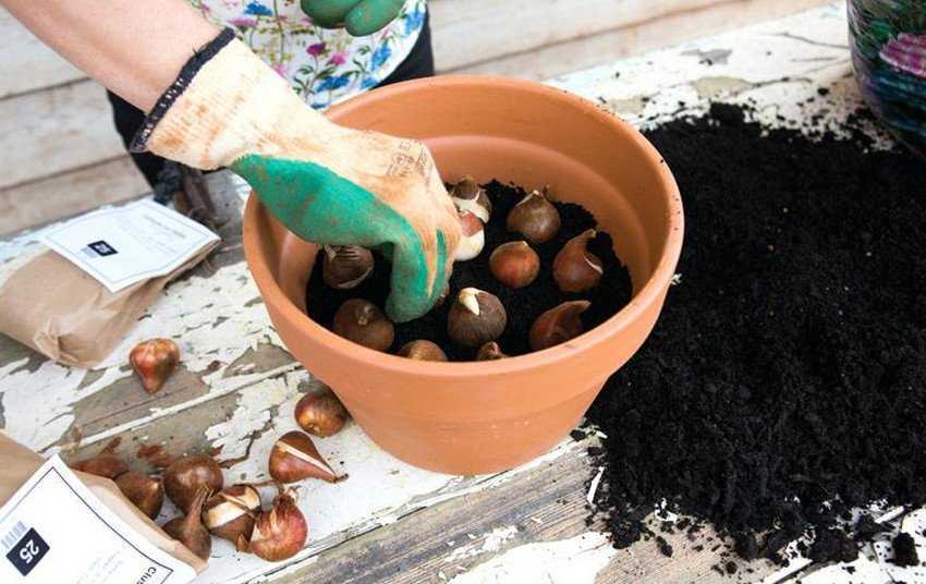 Некоторые садоводы советуют взять 2 части земли из сада, 1 часть компоста и 1 часть чистого песка. Добавляют к смеси 50 г золы. Перемешивают. Заполняют горшок на 2/3, высаживают луковицы и досыпают грунт. После посадки поливают бледным раствором марганцовки. Затем ёмкости переносят в прохладное место с температурой от 0°С до +10°С. Времени на эту фазу понадобится около 4 недель. После чего температуру воздуха возле контейнеров понижают до -2°С и накрывают плёнкой, чтобы избежать лишней потери влаги.