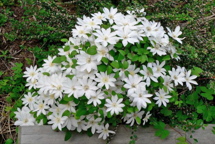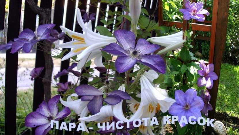 Выгодно оттеняют красоту клематиса соседство с калиной, жасмином, хвойными растениями, лилейниками и лилиями, спиреей, пионами, чубушником, плющом, форзицией и девичьим виноградом.