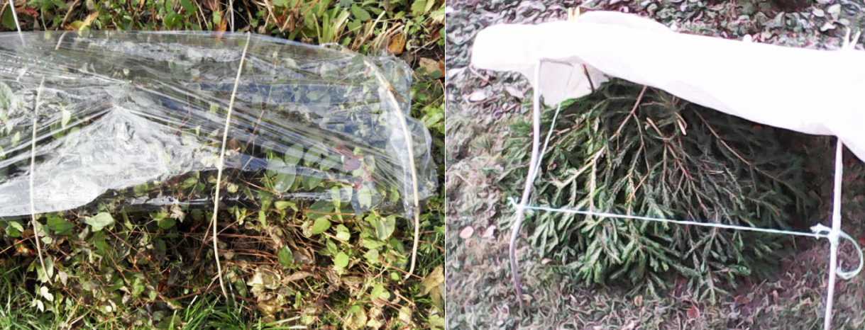 Нельзя допускать влажности, поэтому пленку не настилают на куст, не прижимают его плотно к земле, а ставят низкие дуги. Сами побеги лучше уложить на лапник, хворост, прикрыть их сверху лапником, затем материалом не пропускающим воду и только потом опилками, торфом, землей. Как вариант – забрасывают снегом.