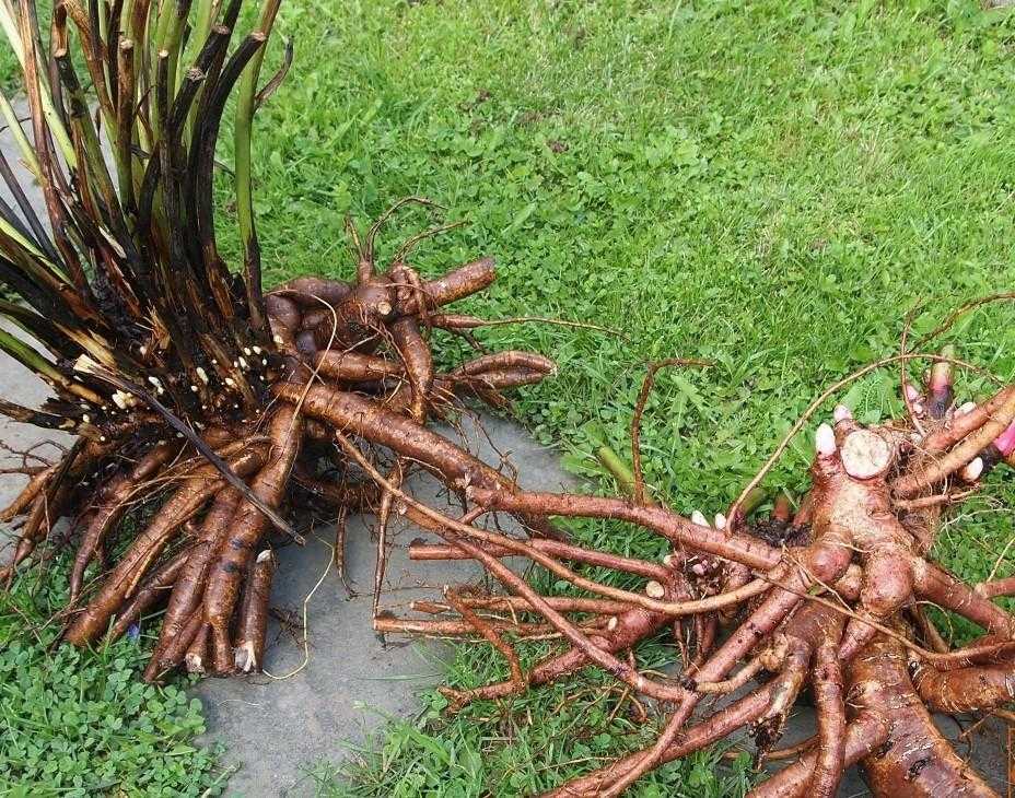 Подгнившие, повреждённые и сухие корни удаляют, а остальные подрезают на 10-20 см. На каждом корневище необходимо сохранить не менее 3 почек.
