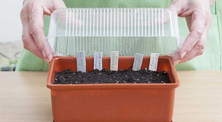 Накройте посевы, чтобы почва постоянно оставалась во влажном состоянии. Для этого удобно использовать подходящую по размеру крышку от пищевого контейнера. Можно просто поставить емкость с посевами в чистый полиэтиленовый пакет и убрать в светлое место. При температуре +15…+20°С всходы бархатцев появляются через 5-7 дней. Температурный режим важен, потому что при температуре ниже +15°С семена всходят плохо, а если она поднимается выше +25°С не всходят совсем.