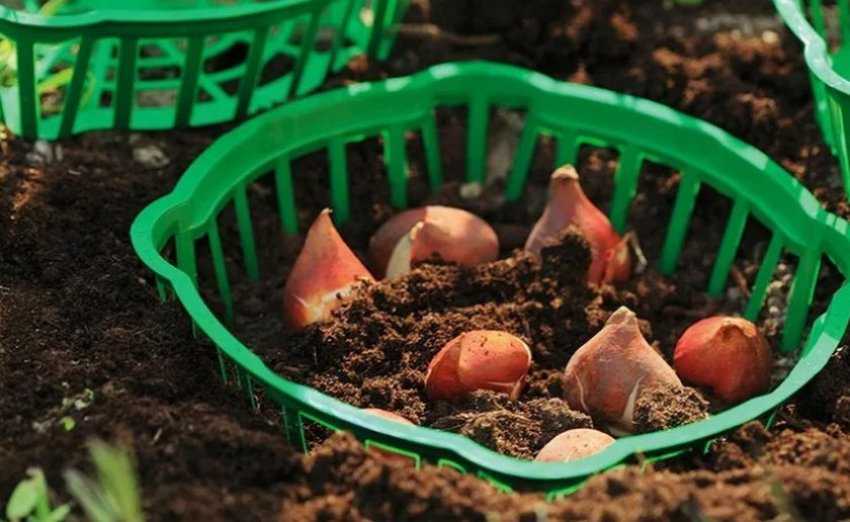 Отдельно следует упомянуть о способе посадки луковичных растений, подразумевающих использование специальных корзин. Такие приспособления, которые без труда можно найти в специализированных магазинах, помогут защитить тюльпаны от вредителей, обитающих в земле.