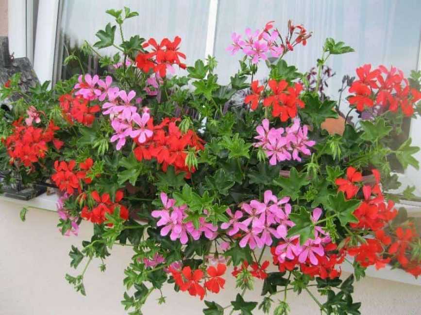 Плющелистная герань представляет собой ползучие побеги до 1 метра. Листья мясистые пятиугольной формы. Растет обильным каскадом, спуская стебли вниз. Такой сорт хорошо используется для украшения балконов, фасадов, арок.