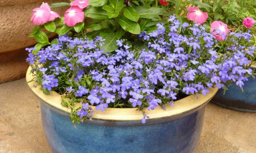 И многими другими, список можно продолжать и продолжать. Особенно хороши контрастные сочетания: холодная гамма лобелии с яркими цветами оранжевого, желтого, красного цвета. Очаровательно смотрится гамма под гжель — синий плюс белый. Также может быть удачной посадка нескольких разных сортов лобелии различных оттенков.