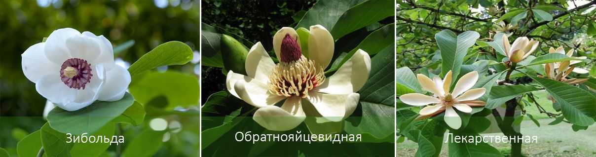 | Обратнояйцевидная или белоцветная | Листопадное дерево, родиной которого является один из Курильских островов, достигает в высоту 15 м. Стебли покрываются серой корой, гладкой по текстуре, а заканчиваются – 8-10 листочками. Цветки большие (около 16 см в диаметре), представлены кремовыми оттенками, источают сильный аромат. Растение благополучно переносит холод и тень, однако капризно к уровню влаги и составу грунта. Подвергается культивированию со второй половины XIX века. |