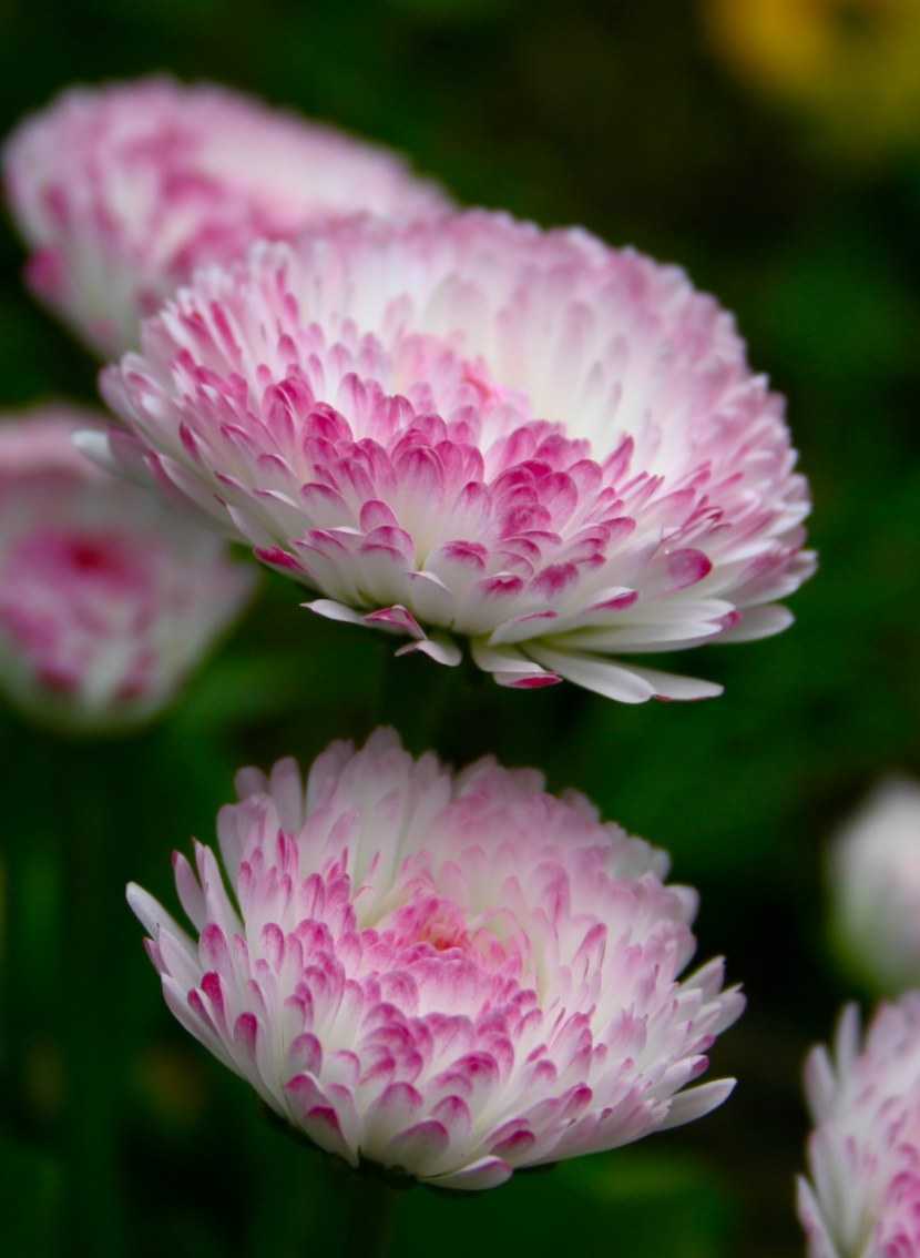 Благодаря разнообразию цветовой гаммы и привлекательному внешнему виду, большинство сортов маргариток нашли свое применение в ландшафтном дизайне. Кроме белых, розовых, красных и их оттенков, встречаются эффектные двухцветные экземпляры, и даже в полосочку или крапинку. Пышные махровые соцветия, словно яркие новогодние шарики, на низкорослых кустиках выглядят нарядно и впечатляюще.