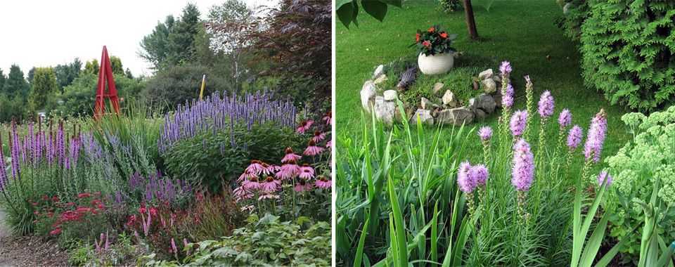 - Лиатрис – многолетнее травянистое растение с пышным цветением. Осенний цветок представляет собой прямой стебель, усеянный игольчатой листвой, напоминающий веточку сосны. Верхние полметра стеблей усеяны фиолетовыми, красными, розовыми соцветиями.