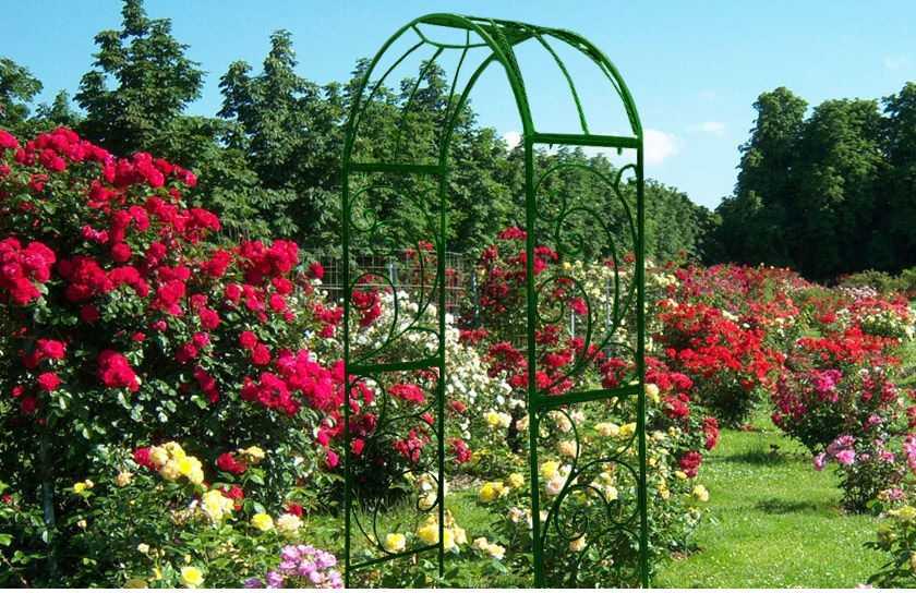 Арки для плетистых роз можно окрашивать в различные цвета в соответствии с общим дизайном участка