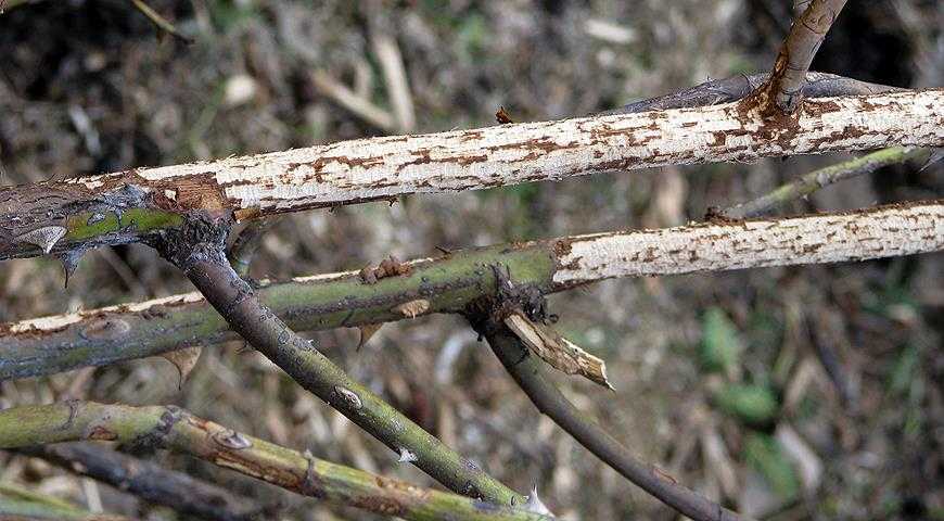 Побеги розы, поврежденной за зиму мышами. Единственный раз, когда розы плохо вышли после зимы, был в 2010 году. И виноваты были не мороз и не оттепель. Зима была такая снежная и морозная, что мышам было нечего есть, и они в прямом смысле этого слова съели мои розочки, т.е. счистили с побегов всю кору! Розы пришлось обрезать полностью! Но через год у меня уже снова были аккуратные, помолодевшие кусты, а через два я поняла, что такая сильная обрезка несомненно пошла им на пользу.