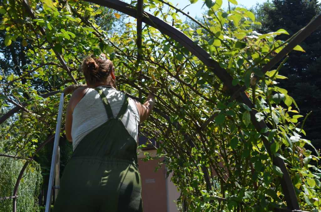 - Достаточно подросшие побеги нужно отводить в сторону, иногда направляя слегка вниз. Они должны подвязываться в горизонтальном направлении.