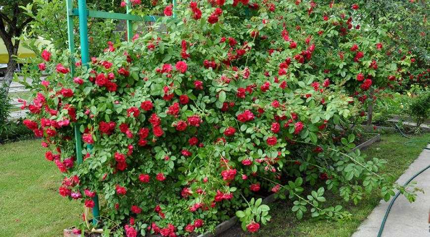 Устройство шпалеры для плетистой розы обязательно, так как без применения основы стебли будут стелиться по земле, повторяя контуры почвопокровных растений.