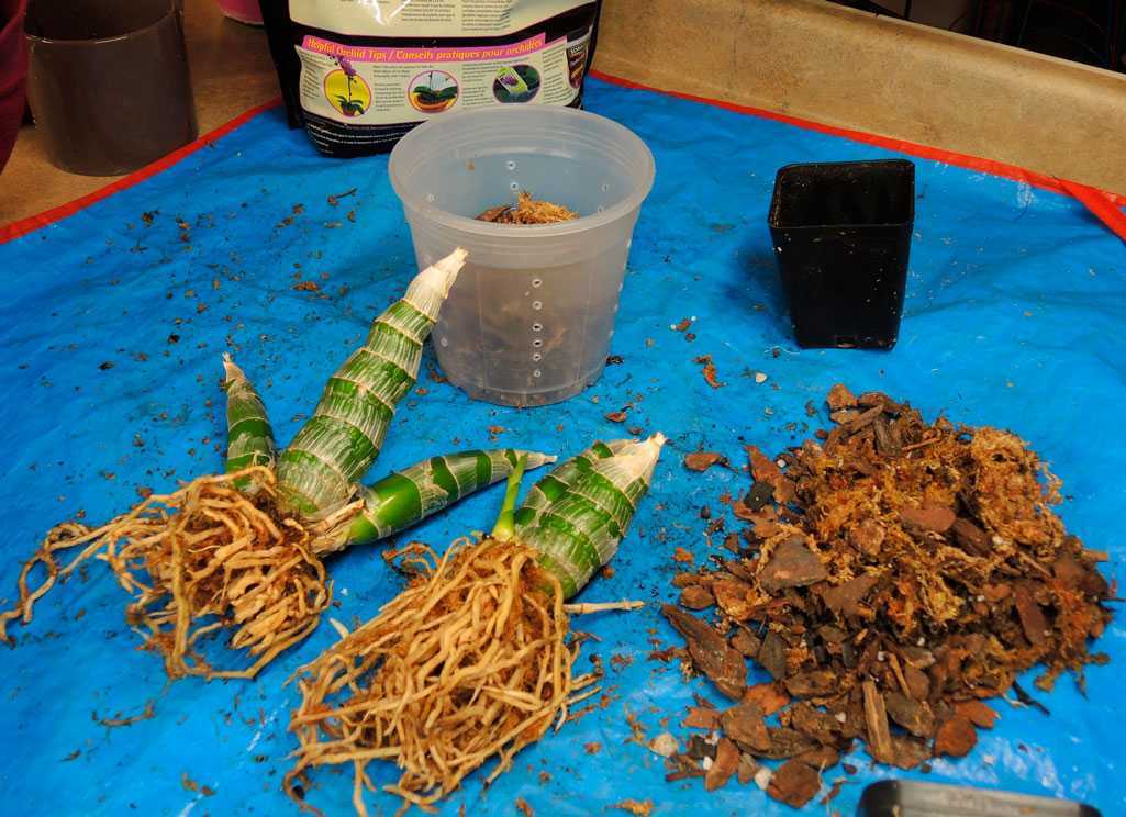 Затем цветок вместе с оставшимся на корнях субстратом следует положить в теплую воду на 1-2 часа. Кору и другие частички смыть под душем. Если корни повреждены, их нужно осторожно срезать, оставив только здоровые, а место среза обработать толченым углем. Дать орхидее хорошо просохнуть. Растение поместить в прозрачный горшок с подготовленный керамзитом, понемногу засыпая со всех сторон его субстратом, но не уплотнять