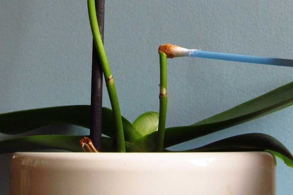 Перед обрезкой кроме инструментов надо запастись средствами, которые прижгут место среза и не дадут патогенным бактериям проникнуть внутрь. В качестве таких средств применяют активированный уголь, йод, зеленку, марганцовку или корицу. После того, как орхидея обрезана, срез смазывают дезинфицирующим раствором или втирают сушащий порошок. У некоторых видов орхидей цветонос внутри полый. В этом случае срез надо запечатать пчелиным воском, чтобы внутрь не попала вода или не проникли вредители. Избавиться от непрошенных жителей, поселившихся внутри стебля, значительно сложнее, чем выгнать их с листьев.