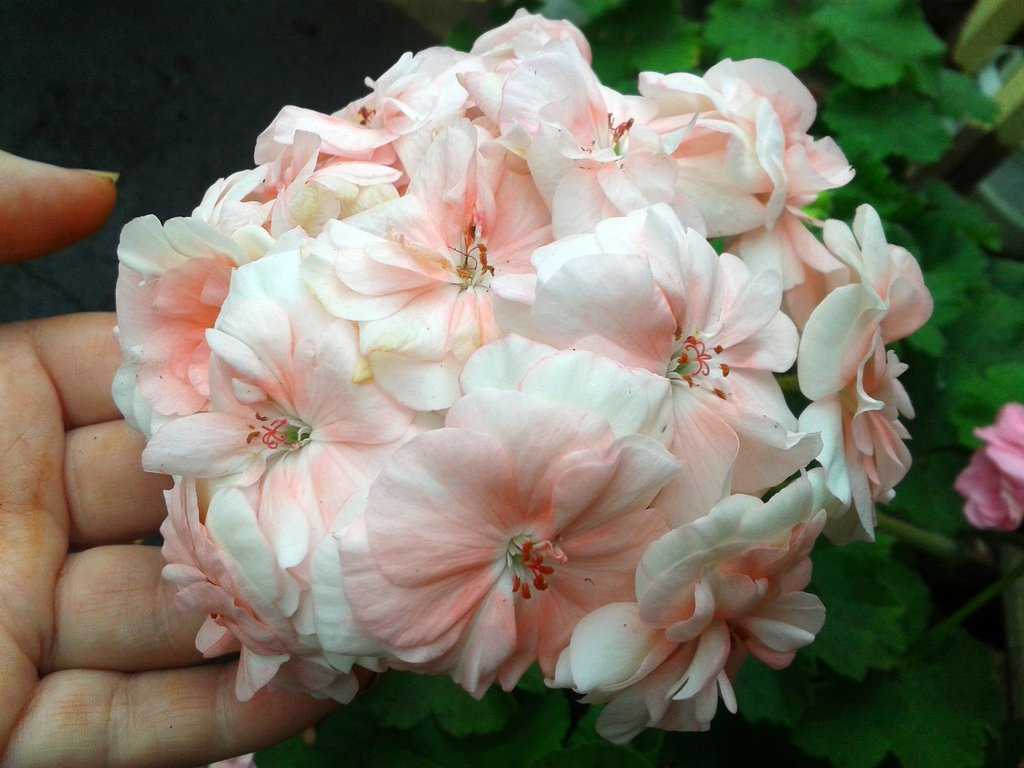 Большие ажурные махровые сливочно-розовые цветочки с нежно-алой серединой собраны в плотные тугие соцветия на длинных цветоносах. Округлые большие опушенные листья зеленого цвета.