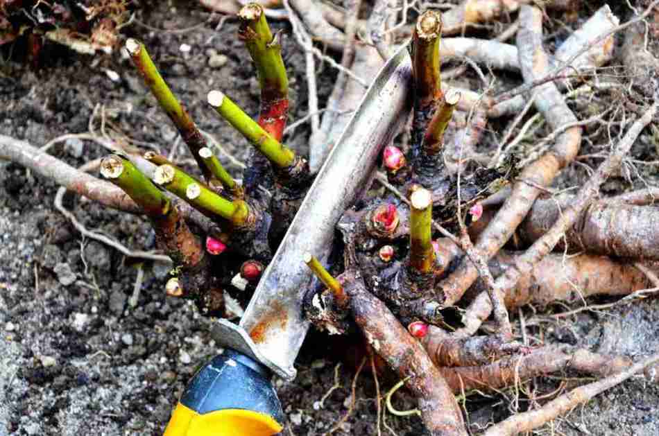Приступают к процессу в августе или в сентябре. Куст аккуратно выкапывают вместе с земляным комом. Почву смывают водой из лейки или шланга. Очищенные растения осматривают, удаляя больные, и укорачивая длинные корни. Места срезов обрабатывают 1% раствором марганцовки и присыпают толченым углем.