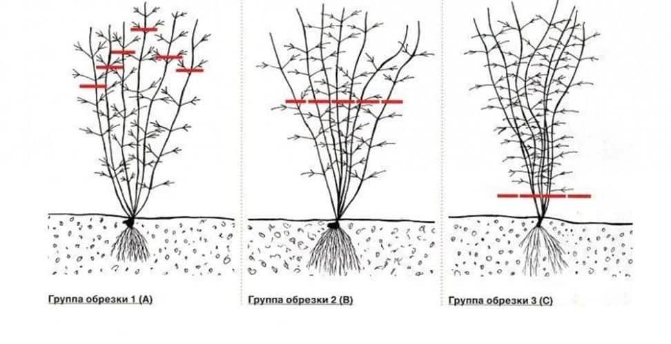 Растения первой группы обрезают в начале весны. Побеги прошлого года обрезают до длины в 0,5 м.. Те молодые побеги, которые закрывают распускающиеся бутоны от солнечных лучей, удаляют почти полностью, оставляя только наиболее мощные из них, которые будут цвести в следующем году. Осенью следует повторить обрезку, удалив все побеги, которые цвели в данном сезоне.