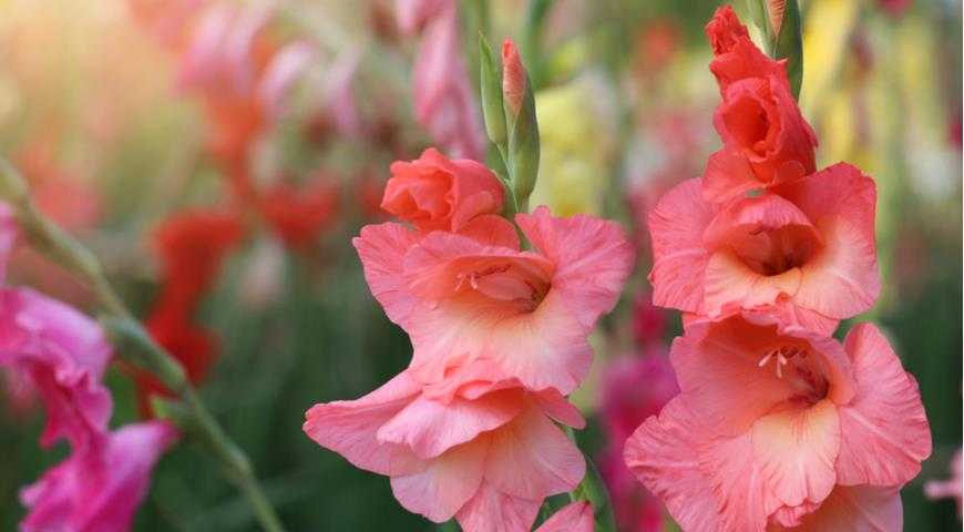 2. Куда и как сажать гладиолусы. Гладиолусы высаживают на солнечном, теплом месте: в тени все сорта зацветут позднее, а растения средних и поздних сроков цветения могут не успеть сформировать цветоносы. Почвы предпочтительны плодородные, хорошо дренированные, со слабокислой реакцией. На одном месте гладиолусы можно выращивать лишь один сезон, иначе растения заболевают, хуже цветут или не цветут совсем. Клубнелуковицы гладиолусов очистите от сухих чешуек, вырежьте нездоровые участки, протравите в фунгициде и посадите, заглубляя на три диаметра. Для профилактики грибных болезней обработайте почву специальными препаратами (например, Фитоспорином-М). Посадки после полива мульчируют верховым торфом. Поливают обильно, промачивая почву на глубину 30–35 см, систематически рыхлят и пропалывают. Подкормки гладиолусов проводят при появлении 2–3 листьев, затем при появлении 6-го листа и в фазе бутонизации. Можно использовать раствор полного минерального удобрения с микроэлементами.