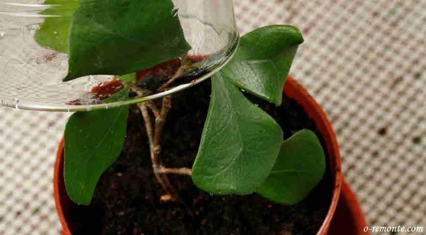 В темную емкость, заполненную водой, помещают отросток так, чтобы листочки не соприкасались с жидкостью.