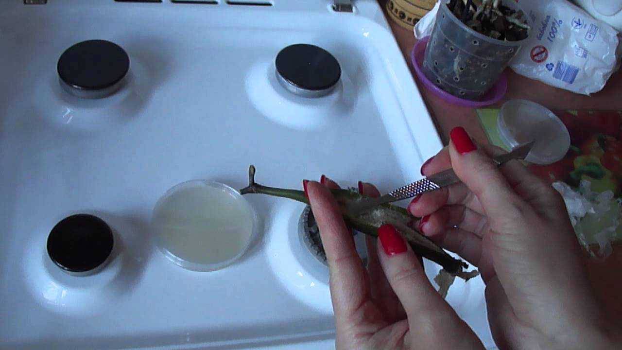 Определите место среза. Оно обязательно должно быть ниже почки на полтора сантиметра. Продезинфицируйте прибор спиртом и сделайте срез. Помните об обработке углем для предотвращении инфекции.