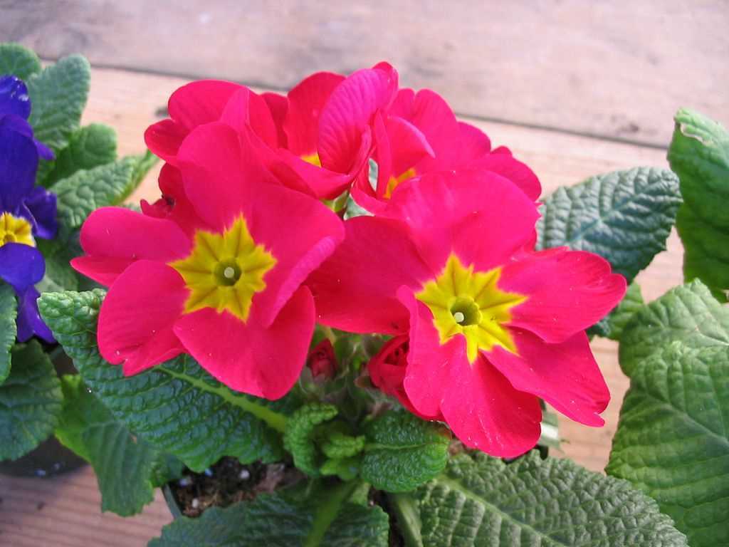 - Примула колоссеа – более крупные цветы с малиновыми лепестками и желтой звездочкой в центре;