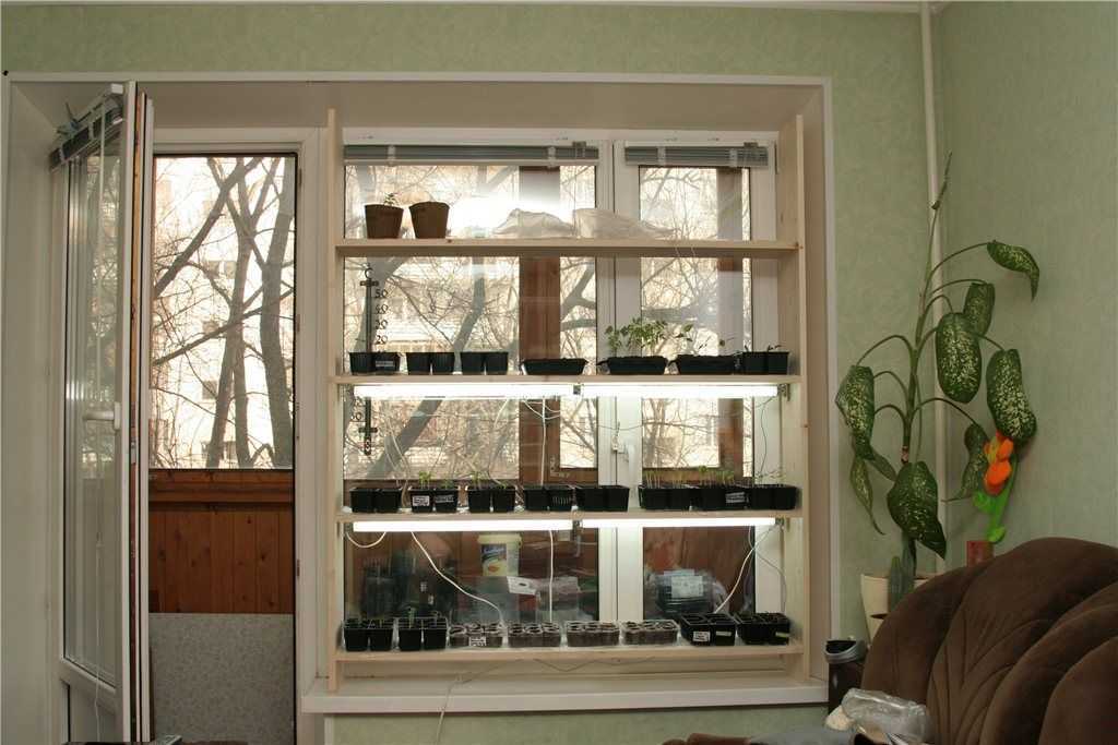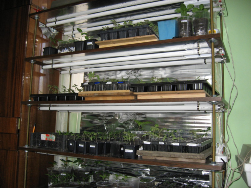 При этом расстояние между полками должно быть не меньше 20-22 сантиметров, чтобы жар от искусственной подсветки не навредил растениям.