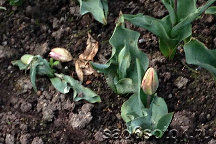 В малоснежные зимы возможно сильное промерзание почвы на глубину до 20 см. Если температуру промерзания почвы до минус 4оС тюльпаны переживают без последствий и нормально цветут весной, то промерзание до минус 9оС чревато различными деформациями цветка. Поэтому после первых заморозков, когда почва на ночь подмерзает, а днем оттаивает лучше укрыть посадки тюльпанов торфом, перегноем, опилками или соломой слоем 10-15 см.