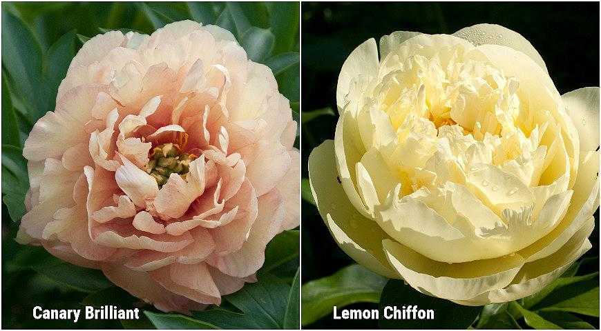Кремовый пион сорта Canary Brilliant и желтый пион Lemon Chiffon