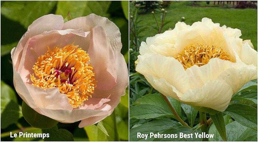 Кремово-желтый пион сорта Le Printemps и желтый пион сорта Roy Pehrsons Best Yellow