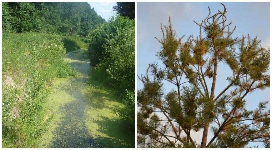 Слева: почвенные гербициды в каналах; справа: сосна, поврежденная пестицидами