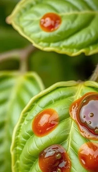 Развитие пятен: Со временем водянистые пятна темнеют, становятся бурыми или черными. В центре пятен может образоваться небольшое углубление. Пораженные листья скручиваются, теряют тургор и могут преждевременно опадать. Внимание: При сильном поражении листья могут покрыться множеством пятен.