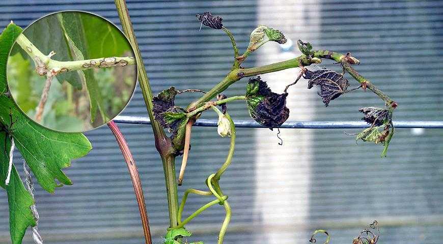 Выпадение осадков весной вызывает раннее поражение молодых листьев и побегов винограда. На листьях появляются бурые пятна с темно-белой каймой, затем ткань отмирает. На побегах и на ягодах бурые или серые вдавленные пятна с темной каймой, т. н. птичий глаз, позднее язвы. Побеги усыхают и надламываются.